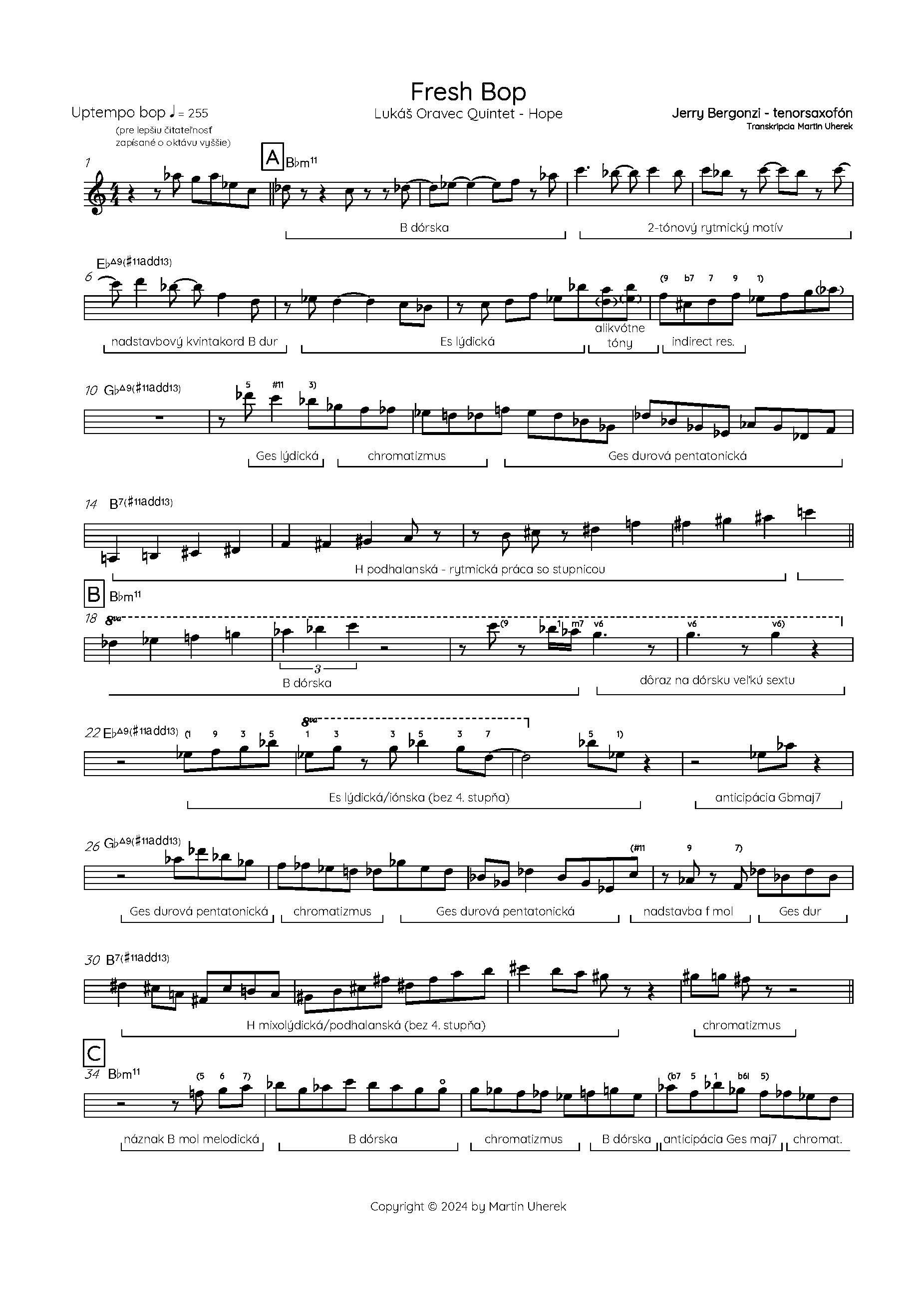 Americký hudobník Jerry Bergonzi (1947) patrí napriek svojmu veku medz najvýznamnejších aktívnych jazzových tenorsaxofonistov na svete. Analyzované sólo sa nachádza na albume Hope (2023) slovenského trubkára Lukáša Oravca, na ktorom Bergonzi hosťoval. Oravcova skladba Fresh Bop je venovaná spomienke na zosnulého tenorsaxofonistu Rostislava Fraša a na albume je v aranžmáne pre jazzové kvinteto, ktorého mám tú česť byť autorom.