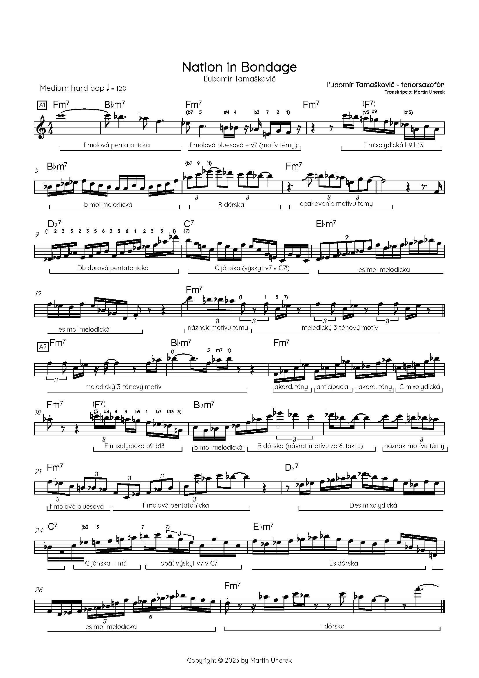 Tenorsaxofonista Ľubomír Tamaškovič bol na vrchole svojej karéry v 70. rokoch považovaný mnohými za slovenského Coltrana. Transkripcia sóla v jeho vlastnej kompozícii Nation in Bondage (prekl. Národ v otroctve) je z nahrávky vystúpenia kapely Combo Ladislava Gerhardta na Bratislavských jazzových dňoch v r. 1978. Pre vtedajšiu komunistickú cenzúru išlo o provokatívny názov, snáď aj preto vyšla na albume Bratislava jazz days 1978 pod názvom Korene. Skladba bola inšpirovaná ľudovou piesňou Darmo ma mať moja, ktorej úvodný motív preberá a spracúva v jazzovom štýle. Sólo tenorsaxofónu má 5 chórusov, my si však rozoberieme prvé dva.
