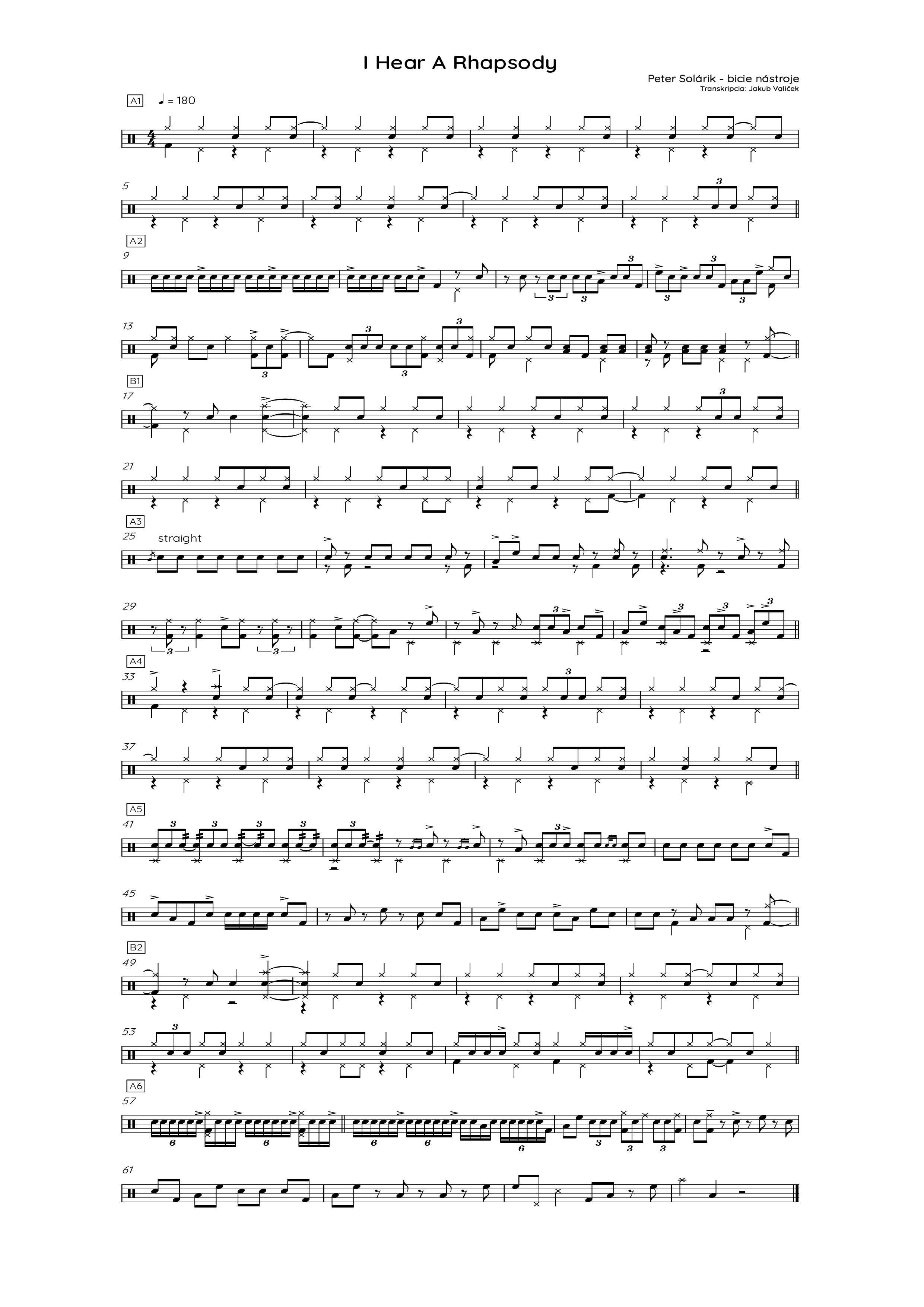 Transkripcia časti známeho jazzového štandardu I Hear a Rhapsody s pravidelnou 32–taktovou formou AABA obsahuje 2 chórusy v medium up tempe. Skladba sa začína klavírnou introdukciou, po ktorej zaznie téma v interpretácii tenorsaxofónu Martina Uhereka. Po sólach saxofónu, klavíra a kontrabasu prichádza časť, v ktorej sa pravidelne striedajú 8-taktové sólové pasáže bicích nástrojov s 8–taktovými sólami saxofónu a klavíra. Notový zápis začína transkripciou sprievodnej hry bicích nástrojov pod saxofónovým sólom (1.–8. takt). Ich dynamika je kvôli kontrastu k predchádzajúcej hre pod kontrabasovým sólom o niečo vyššia. V 9. takte sa začína prvý 8–taktový break bicích. Na jeho začiatku použil Solárik rudiment paradiddle–diddle s rukokladom P L P P L L zadelený do šestnástinových hodnôt. Ich rytmus korešponduje s frázami saxofónu v 6. a 7. takte. Následne, v 12.–13. takte, redukuje rytmické frázy na trioly, rozdelí ich medzi malý bubon, prechody a veľký bubon na jednej strane a činel na strane druhej.